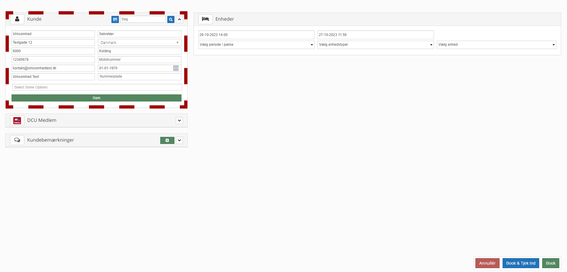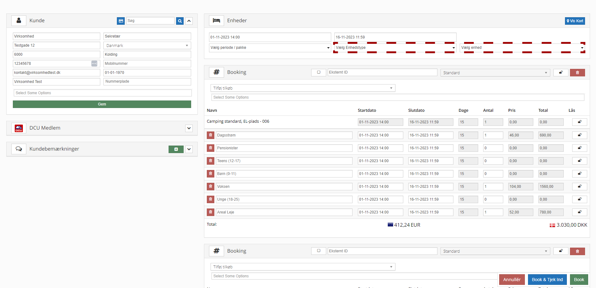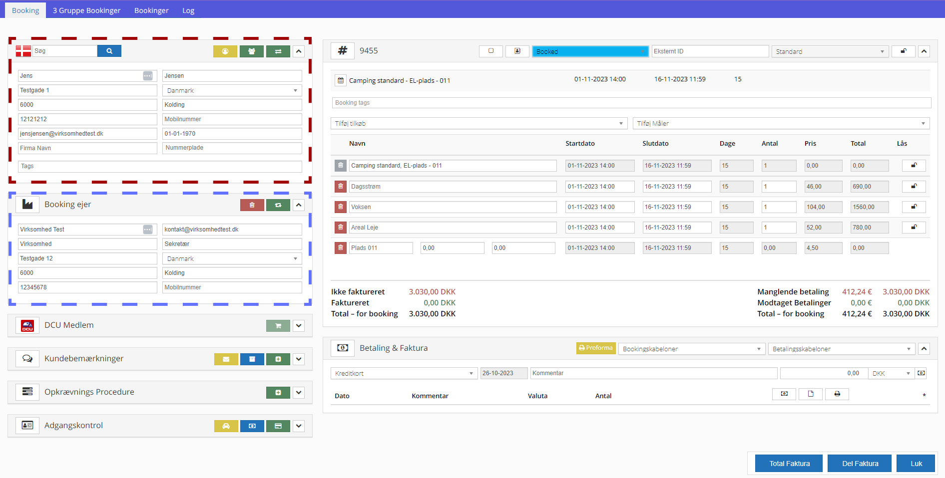 Du har nu med succes tilføjet en firmakunde til bookingen, og vil nu se både medarbejderens informationer (markeret med rød) og virksomhedens informationer (markeret med blå).