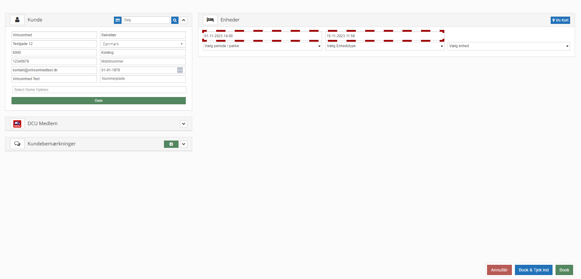 Gå til Ny Booking ( Ctrl + B på dit tastatur ) og indtast virksomhedens informationer. I dette eksempel forestiller vi os, at en virksomhed ved navn “Virksomhed Test” ringer og vil booke 3 pladser til deres medarbejdere.