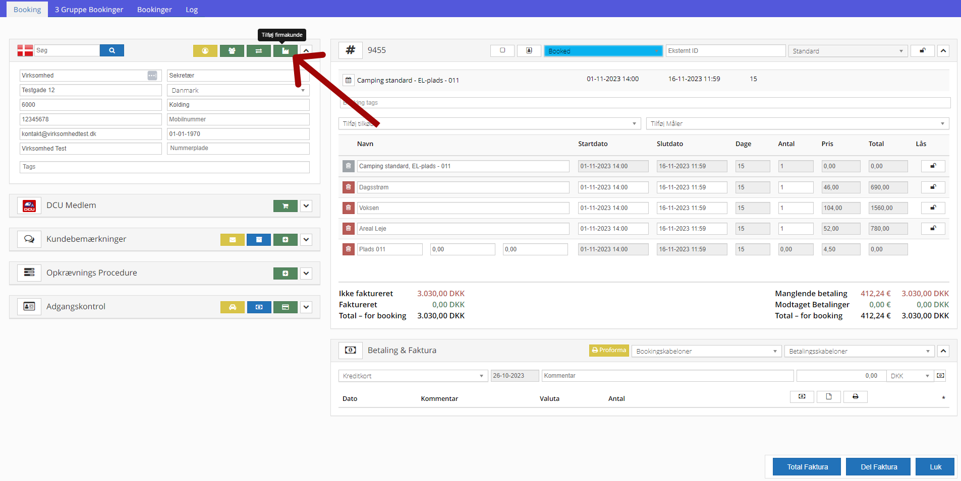 Gå til den booking du ønsker at tilføje en firmakunde på.