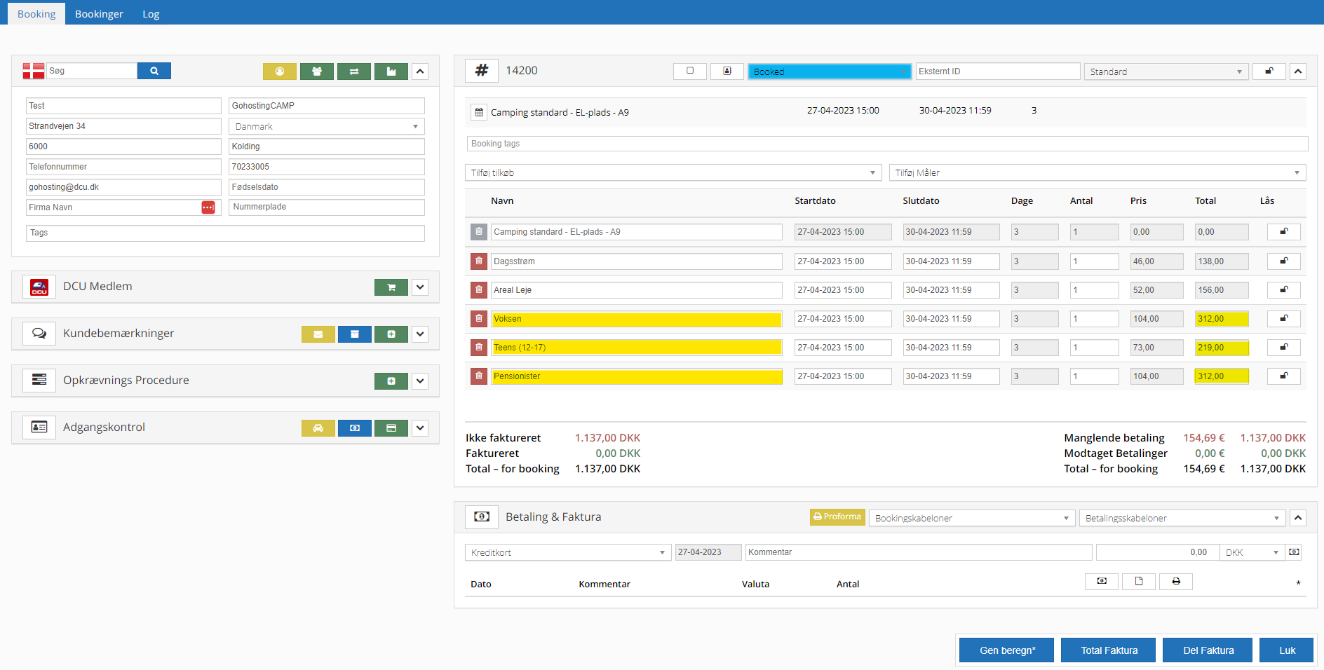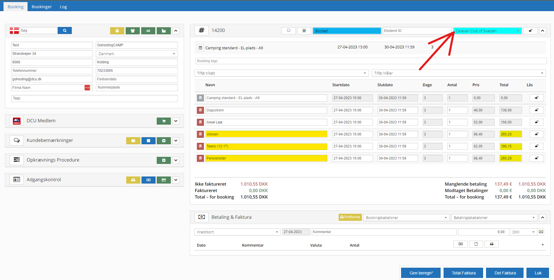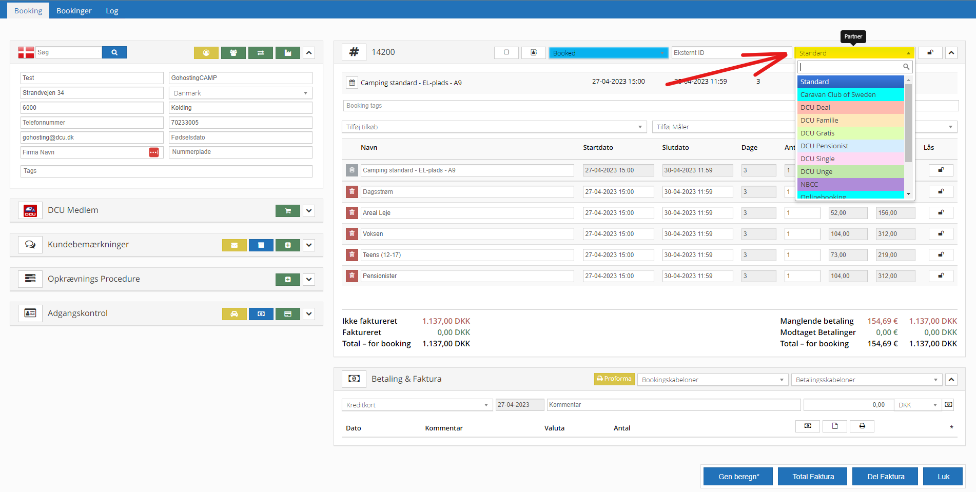Når du har klikket på den ønskede partner, vil denne fremgå i Partner-bjælken og du vil se, at prisen på personer har ændret sig i henhold til rabatten.