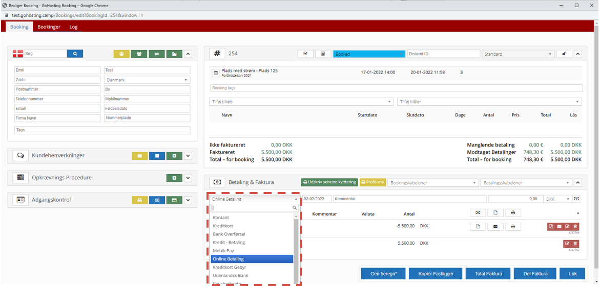 Step 1: Find den ønskede booking og klik på drop down feltet markeret og klik på “Online betaling”.