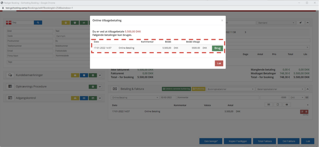 Step 3: Du har nu fået følgende pop-up vindue, hvor der bliver informeret om hvilke beløb du kan tilbagefører. Den fortæller ligeledes, hvis der er et rest beløb som kan eller skal returneres. (OBS! Man kan ikke tilbageføre mere end kunden har betalt på bookingen) Vælg derefter knappen “brug”, for at retunerer det ønskede beløb til kunden, når du har trykket på “brug”, bliver pengene automatisk send til kunden.